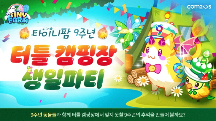 컴투스는 <타이니팜> 유저들과 함께 출시 9주년을 기념하고 게임에 재미를 더하기 위해 ‘터틀 캠핑장에서의 생일파티’ 콘셉트로 다양한 미션 이벤트와 보상을 준비했다.
