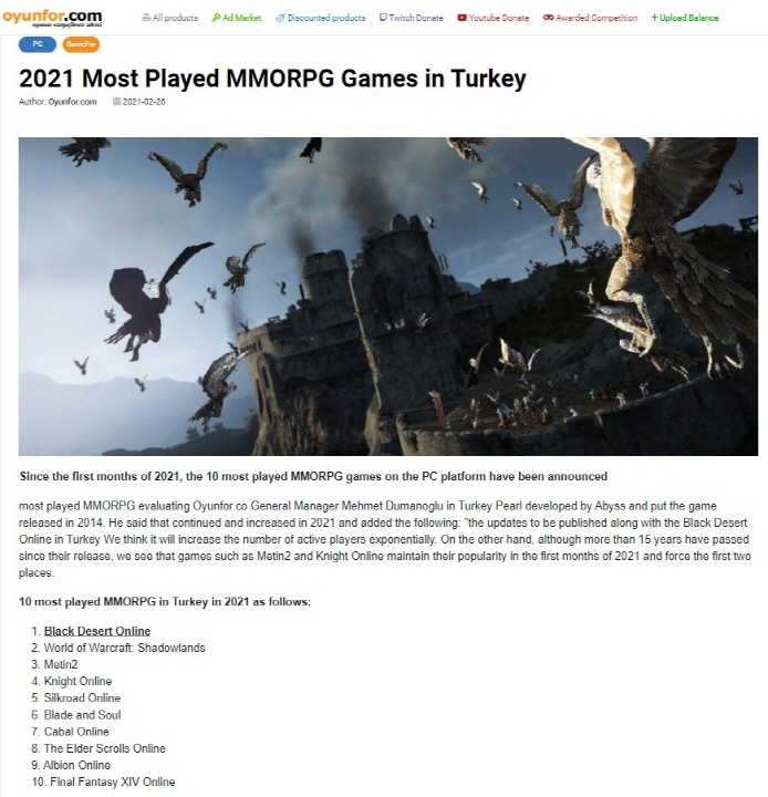터키 지역에서도 <검은사막>이 ‘올초 가장 많이 플레이하는 MMORPG’ 1위로 선정됐다. 터키 최대 규모 온라인 게임 스토어 Oyunfor 집계 자료에 따르면 <검은사막>은 올해 1~2월 가장 많이 플레이 된 현지 게임 1위를 기록 중이며, <월드 오브 워크래프트: 어둠땅>과 <메틴2>가 그 뒤를 이었다.