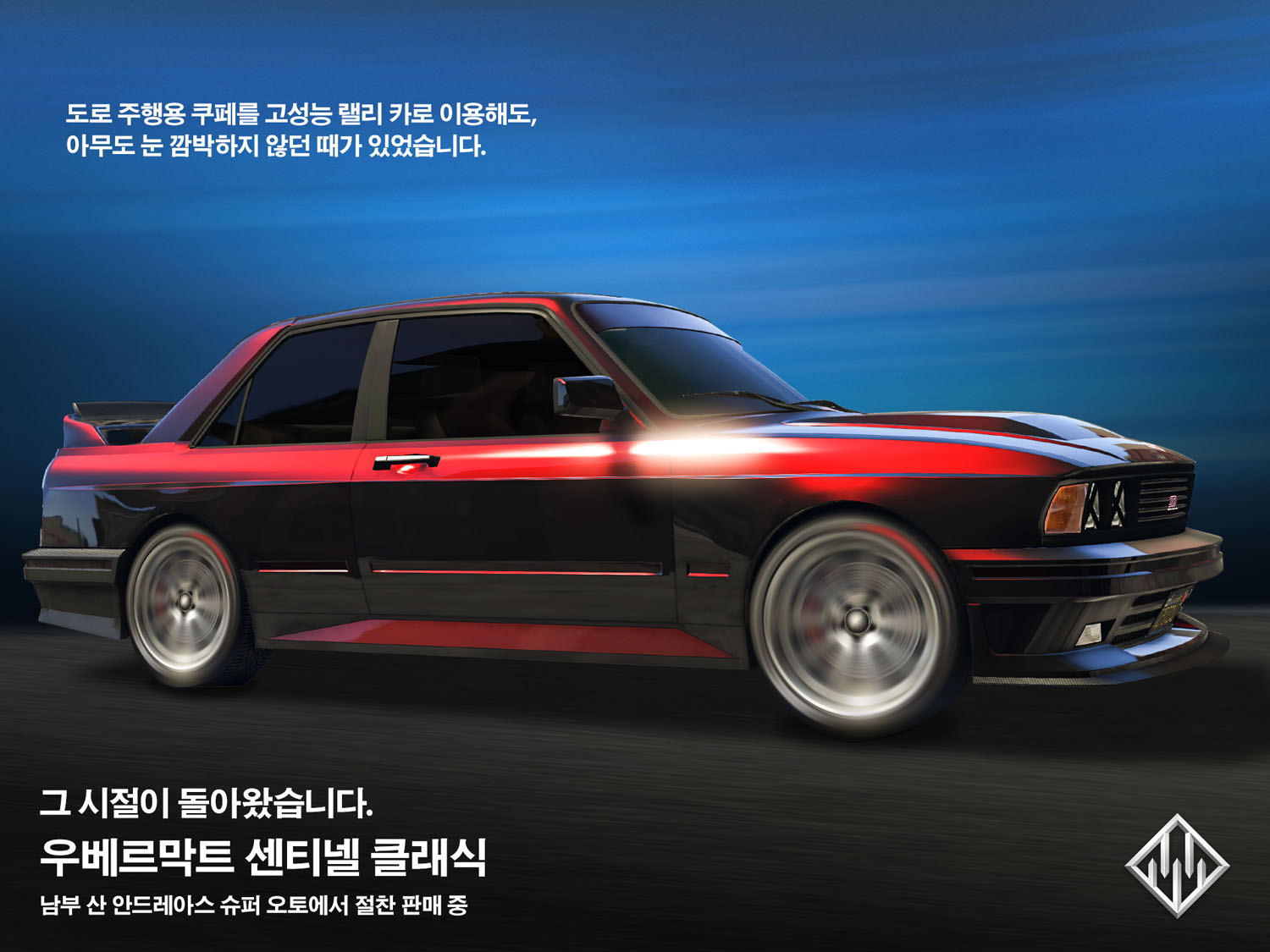 도로 주행용 쿠페를 고성능 랠리 카로 이용해도 아무도 놀라지 않았던 때를 기억하나? 자동 창문과 위성 라디오가 등장하기 전, 그저 당신과 차, 도로만이 있던 그때 말이다. 플레이어가 꿈꿔 왔던 순수하고 가벼운 고속 자동차, 우베르막트 센티넬 클래식를 타고 그 아름다웠던 시절로 돌아가 봐라. 오늘 바로 구입해라. 오직 남부 산 안드레아스 슈퍼 오토에서만 구입할 수 있다.
