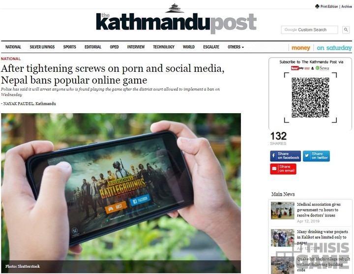 <PUBG 모바일>의 금지 사실을 알린 카트만두 포스트의 기사 캡처.