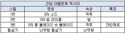 이 기체는 공격력 업과 체력이 60% 이하일 때 유닛의 이동속도와 대쉬속도, 민첩성, 부스터량이 증가하는 트랜스암(건담 아발란체 엑시아)를 스킬로 가지고 있다.