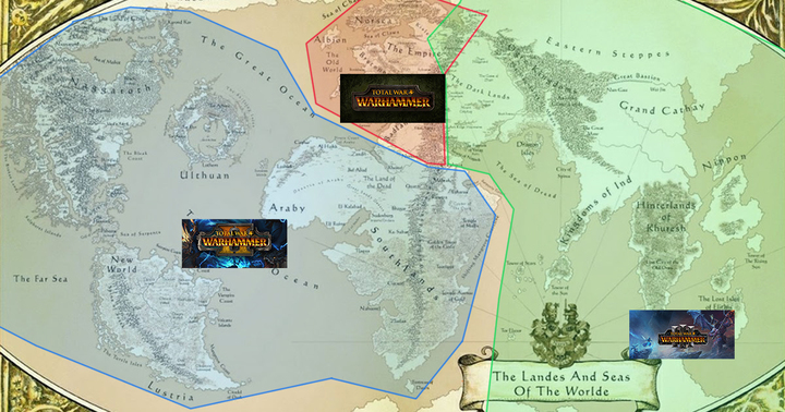 <토탈 워: 워해머>시리즈별 무대. 2편은 대륙간 거리가 조정돼 등장한다.