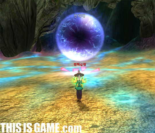 공터를 지나 위로 올라오면, 원형의 구체가 떠 있습니다. 구체 안에는 전기가 흐르고 있네요. 바로 이 녀석이 최종 보스 '천뢰겁원'입니다. 구슬 상태일땐 공격을 하지 않으니 미리 전투준비를 마치기 바랍니다.