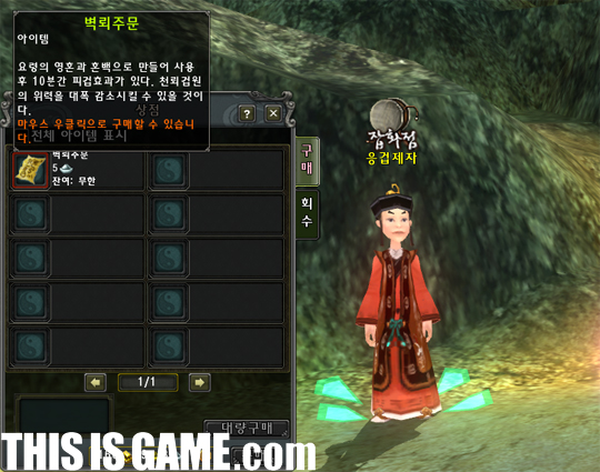 잡화상 NPC는 10분가 피겁효과를 부여해주는 벽뢰주문을 판매합니다. 넉넉하게 챙겨가서 다시 사러 오는 일이 없도록 합시다.