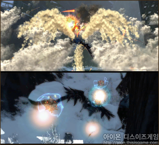 공중에서 캐릭터 주변으로 갑자기 새하얀 연기가 뿜어 나온다. 마치 전투기가 미사일 열추적을 피하기 위해 플레어(비행기를 위한 섬광탄)를 쓰는 듯한 모습이다. 그러나 이것은 <아이온>의 캐릭터가 공중에서 사용 하는 스킬로 뒤에 따라오는 추적자의 시야을 가려 추적을 회피하기 위한 기술로 추측된다.