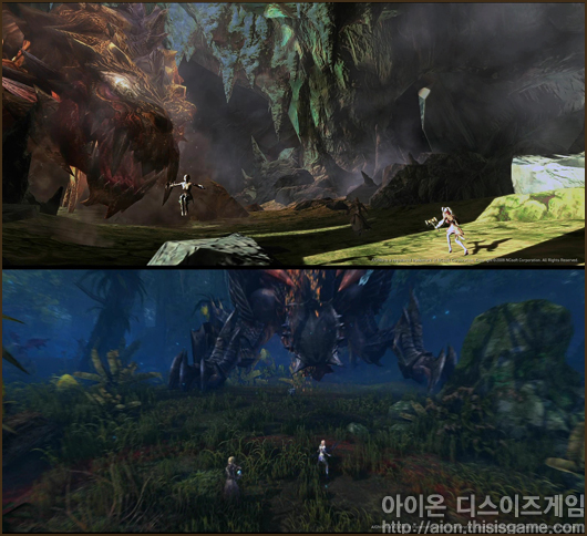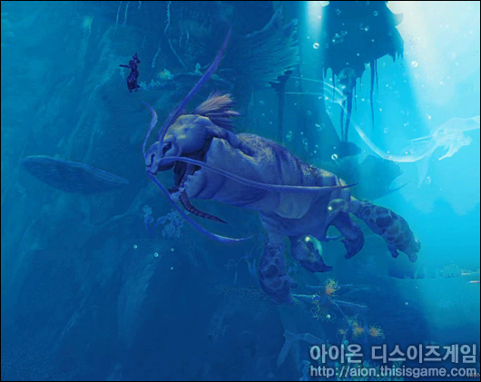 물론 <아이온>에서 단순히 수영만 하는 것은 아니다. 수중전투가 가능하기 때문에 몬스터를 처치할 수 도 있고 아래 스크린샷과 같이 거대 몬스터의 레이드도 가능하다.