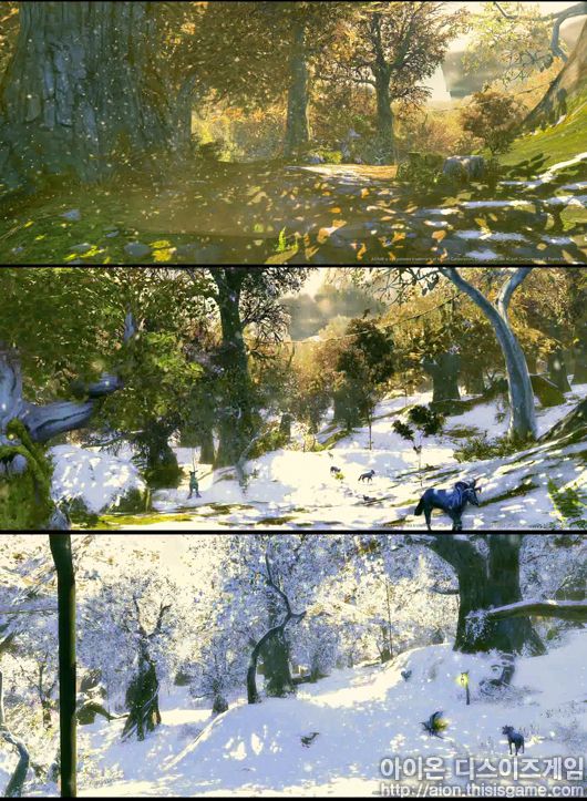 기상 효과는 여기서 끝이 아니다. 지역마다 계절의 변화가 생긴다. 파릇파릇한 녹지대가 낙옆으로 변하고 심지어 그 위에 서서히 눈이 내리기 시작한다. 어느정도 눈이 쌓이면, 결국 눈 밭으로 변하여 <아이온>에 겨울이 오게 된다.