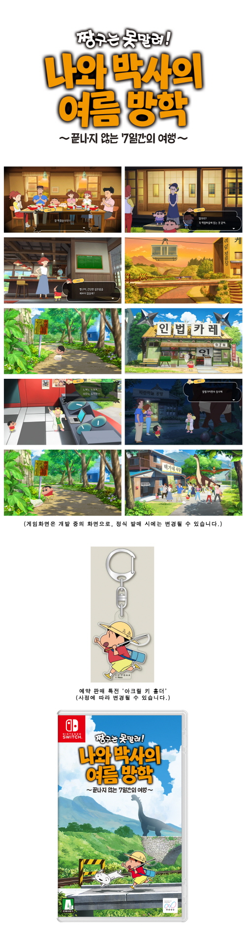 일본의 게임 제작사 ‘네오스’는 ‘대원미디어’와 협력하여 5월 4일 발매하는 닌텐도 스위치 전용 여름방학 체험 어드벤처 게임, <짱구는 못말려! ‘나와 박사의 여름 방학 ~끝나지 않는 7일간의 여행~>의 예약 판매를 내일(8일) 개시한다고 발표했다.