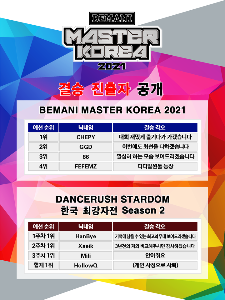 BMK 2021 결승은 총 3부로 나누어서 진행되며, 현재 인기리에 가동 중인 ‘댄스러시 스타덤 한국 최강자전’이 1부, 전국 게임센터의 최강팀을 가리는 ‘게임센터 팀배틀’ 결승이 2부, 그리고 대한민국 BEMANI 유저의 최고 실력자를 결정하는 ‘BMK 2021 결승’이 3부에서 펼쳐진다.