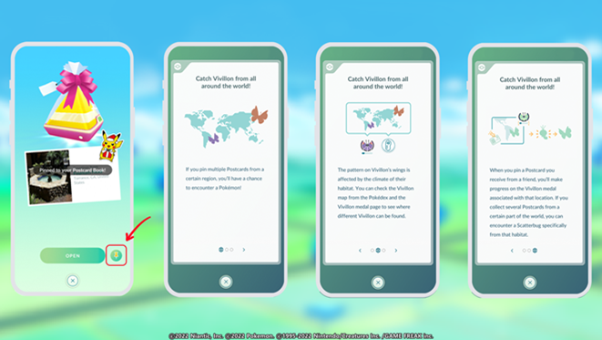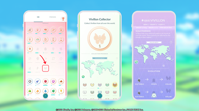 <포켓몬 GO>에서는 엽서를 모으는 것으로 다양한 무늬의 ‘비비용’을 만날 수 있으며, 선물, 포켓스톱, 체육관에서 받은 엽서를 핀으로 고정하면 ‘비비용 컬렉터 메달’ 페이지가 열린다.