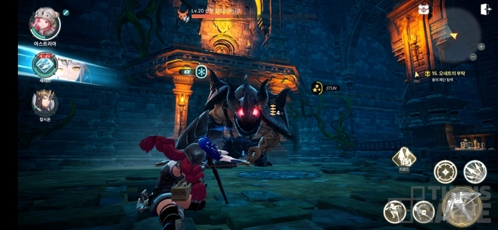 기본적으로는 3개의 캐릭터를 적절한 순간에 자주 교체하며 '태그 스킬'을 발동하는 방식이 중심에 있고, 평타와 스킬 사이에 조건이 달성되면 전개되는 연계 스킬도 눈에 띈다. 가령 '세리스'가 얼음 회오리로 적들을 공중에 띄우면, 세리스 본인은 공중에 뜬 적들에게 얼음 화살을 추가로 넣는 액션이 활성화되고, '칼시온'처럼 에어본 연계 기술이 있는 캐릭터는 공중에 화염 구체를 만들며 에어본 상태의 적들을 공격하며 교체 등장한다.