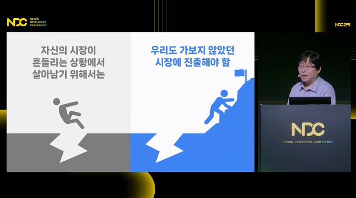 2025년의 NDC의 핵심은 '콘솔'과 '글로벌'이었다. 넥슨코리아 박용현 부사장의 키노트 강연에서 이를 강조했다. 박용현 대표는 국내 게임 업계가 처한 상황, 콘솔과 글로벌 시장에 '빅 게임'으로 도전하는 이유 그리고 극복해야 할 과제를 명쾌한 비유와 구체적인 사례를 들어 설명해 방청객들에게 깊은 인상을 남겼다.