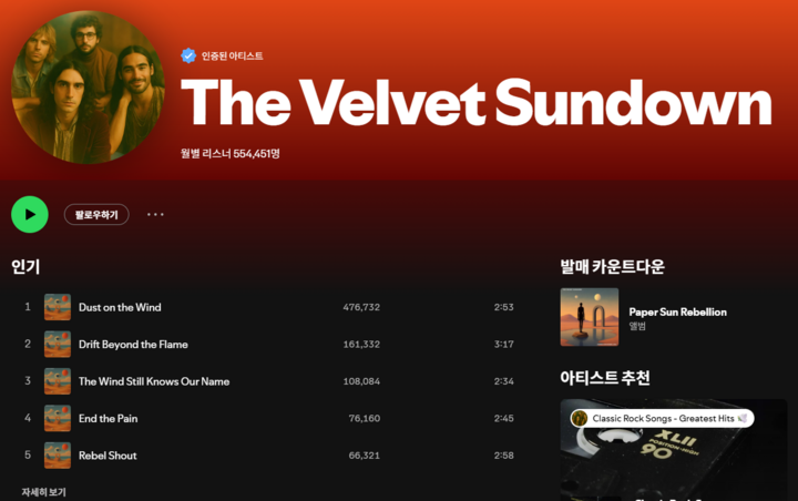데뷔 한 달 만에 스포티파이에서 55만 청취자를 기록한 사이키델릭 록밴드가 화제다. '벨벳 선다운'이라는 4인조 밴드는 6월 5일 첫 앨범을 낸 이후 엄청난 성공을 거두었다. 스포티파이의 큐레이터들은 이 밴드의 노래를 자신의 플레이리스트에 삽입하면서 이들은 깜짝 스타가 됐다.