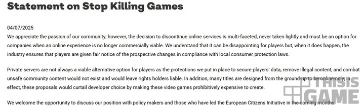돈을 주고 구매한 입장에선 구매 당시엔 예고 또는 명시되지 않았던 서비스 종료가 달갑지 않은 게 현실이다. 하지만 그리 단순하게 접근할 문제가 아니다. 2025년 7월 4일, 유럽연합 내 게임 개발사와 퍼블리셔 단체 중 하나인 비디오 게임 유럽은 소비자들의 "스탑 킬링 게임" 운동에 반대하는 공식 성명을 발표했다. "비디오 게임 제작 비용을 증가시켜 개발자들의 선택권이 제한될 수 있다"는 우려를 표한 것이다.