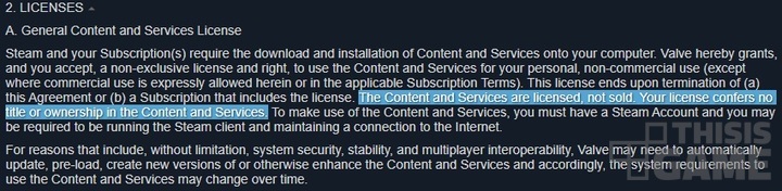 스팀 또한 "콘텐츠 및 서비스는 라이선스를 제공하는 것이지 판매되는 것이 아니다. 귀하의 라이선스는 콘텐츠 및 서비스에 대한 권리나 소유권을 부여하지 않는다"고 명시하고 있다.