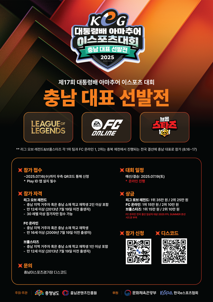 충청남도와 (재)충남콘텐츠진흥원(원장 김곡미)은 제17회 대통령배 아마추어 이스포츠 대회('대통령배KeG') 충남 대표 선발전을 개최한다고 밝혔다. 이번 대회는 충남 지역의 우수 아마추어 이스포츠 인재를 발굴하고, 전국 결선에 충남을 대표하여 진출할 선수들을 선발하는 중요한 자리로 마련되었다.