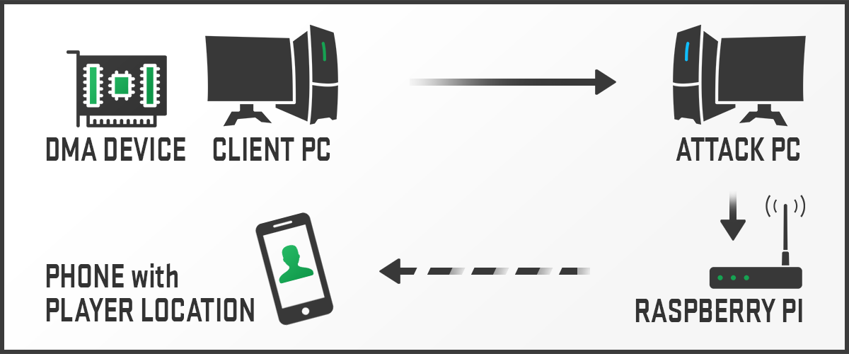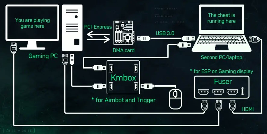DMA는 PC의 PCI-익스프레스(간단히 말해 ‘그래픽 카드’ 같은 것을 꽃는 슬롯)에 장착돼 CPU의 제어를 우회해 게임을 실행하는 PC 외부에서 핵 기능을 구현한다. 준비물로만 PC 두 대가 필요한데, DMA 카드를 통해 한 PC에서는 게임만 실행하고, 다른 PC에서는 핵 프로그램을 구동하는 식이다. DMA 카드는 직접적인 연결을 통해 게임이 실행되는 PC의 게임 데이터를 핵이 구동되는 PC에 전송하는 역할을 맡는다.