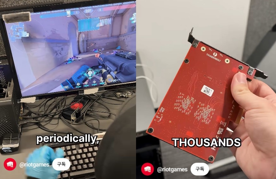 ▲ DMA 카드 등 핵 프로그램에 사용되는 하드웨어의 종류 또한 다양하며, 개중에는 값비싼 프리미엄 장비도 있는 것으로 알려졌다. 사진은 라이엇 게임즈가 입수한 장비와 실제로 DMA 카드와 같은 하드웨어를 통해 핵이 구동되는 모습 (출처: 라이엇 게임즈)