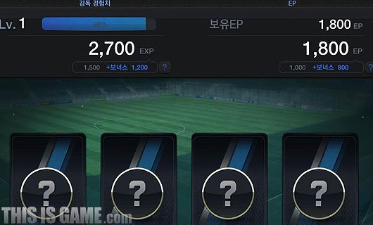 <피파온라인 3>는 한 경기를 치를 때마다 경험치와 EP를 보상받는다. 아직 감독 레벨이 낮은 상태기 때문에 보상 금액이 적은 편이지만, 이겼을 때와 졌을 때 벌어들이는 EP의 차이는 크다. 필자의 경험상 1~2레벨을 기준으로 이겼을 때는 1800 EP를, 비기거나 졌을 때는 1000EP를 받았다.