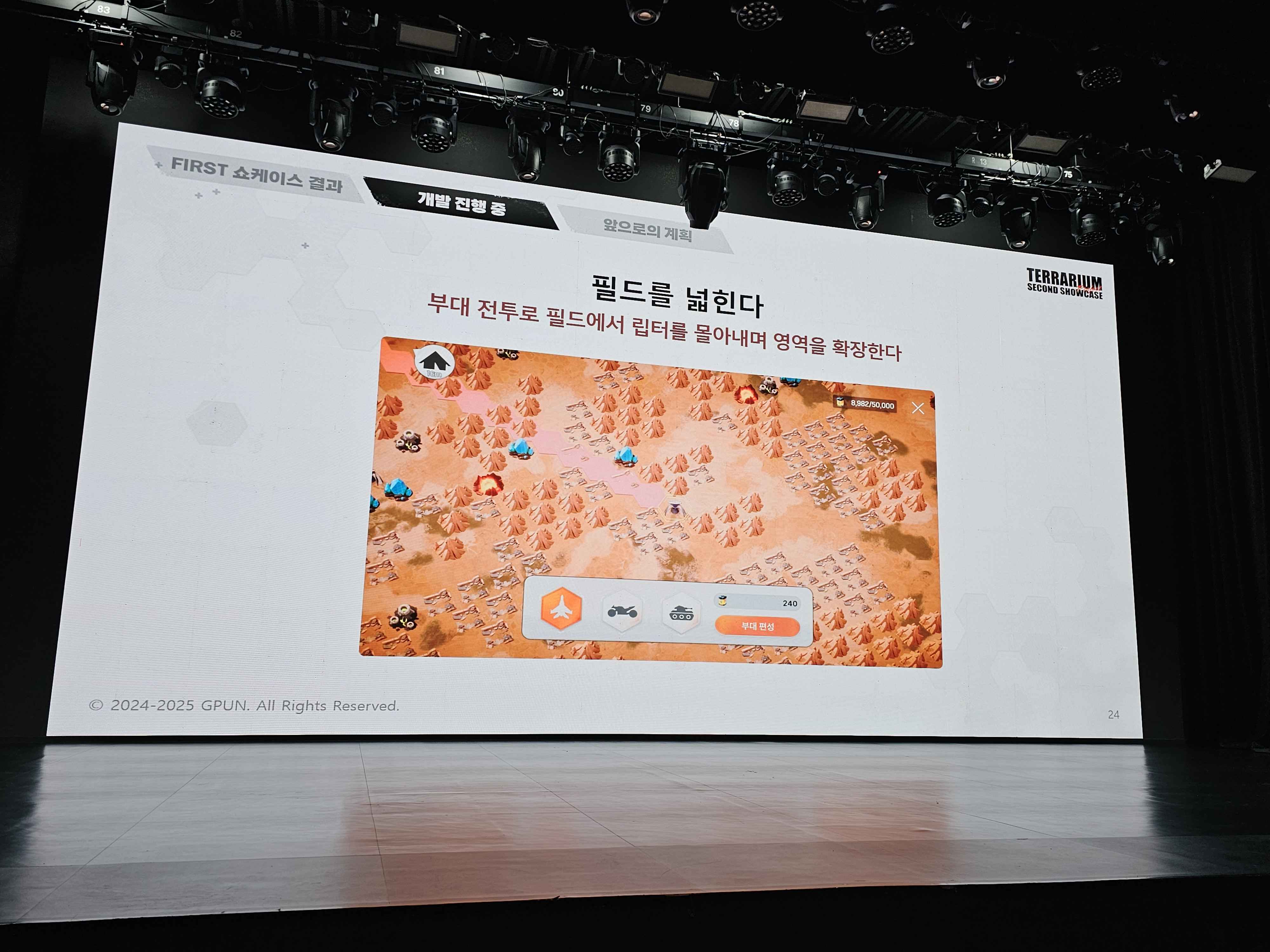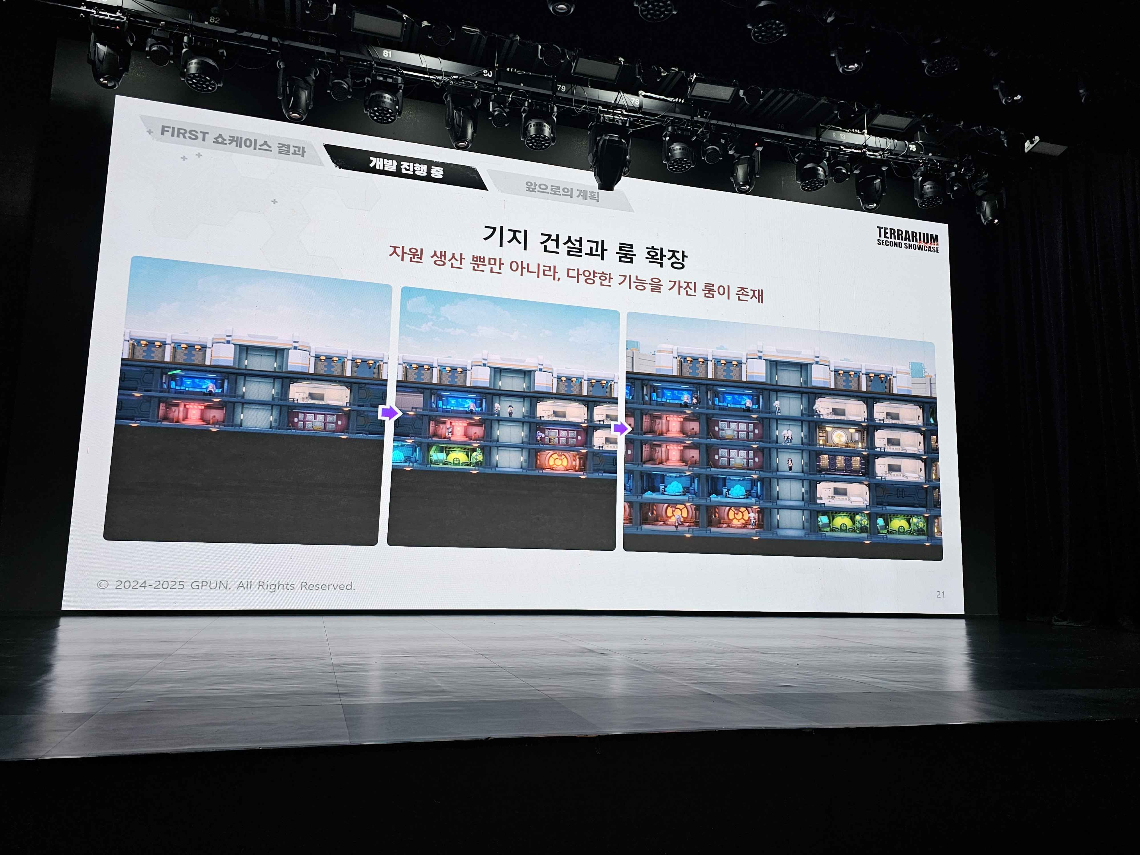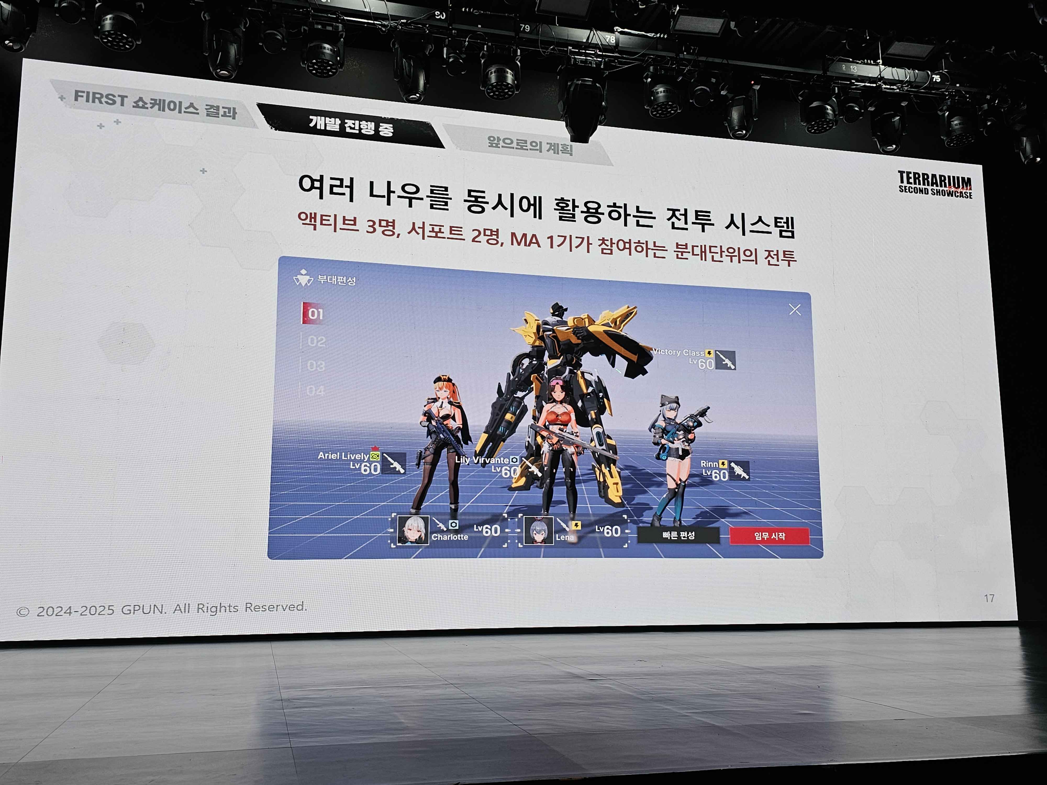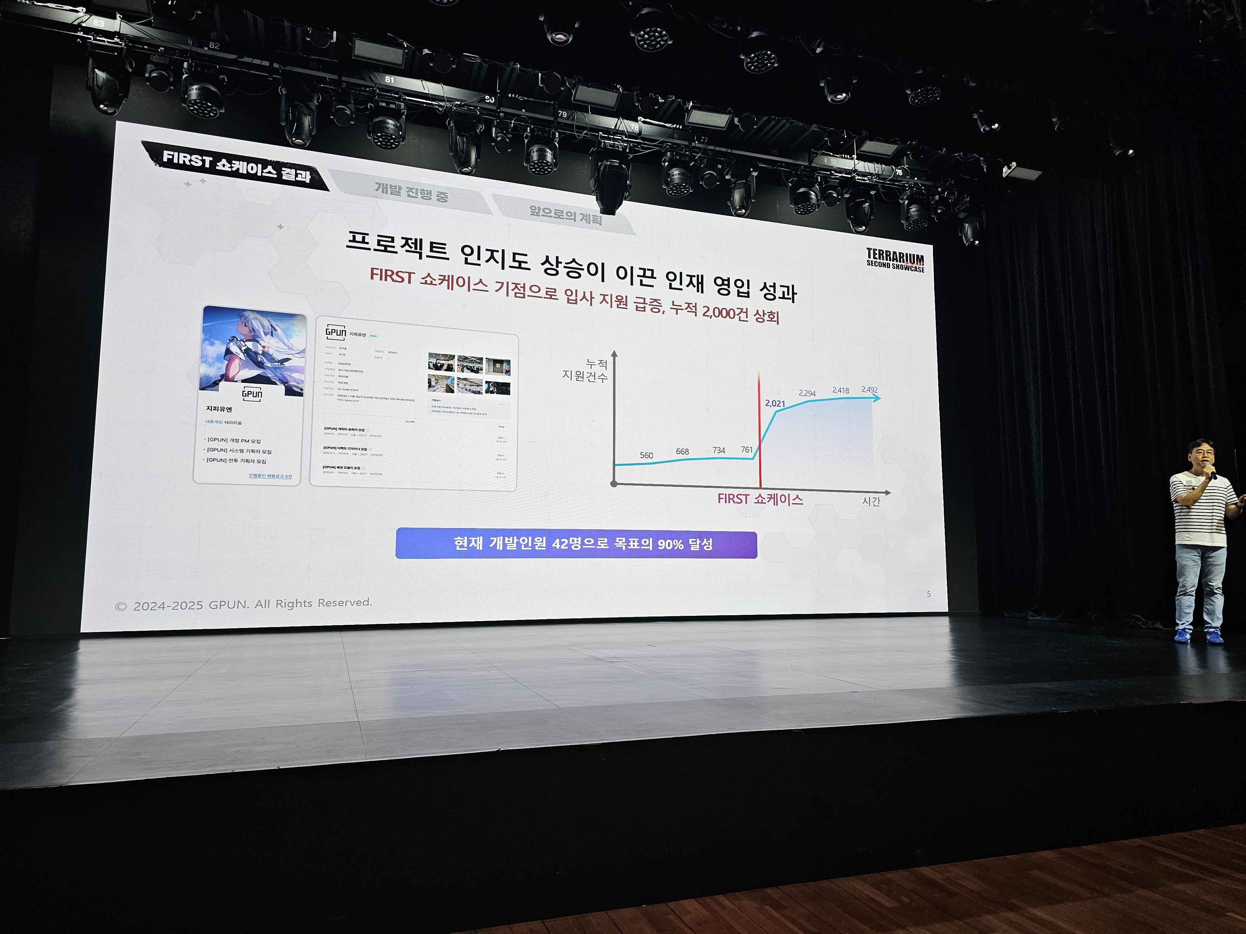 1차 쇼케이스 이후 지피유엔의 <테라리움>에 대한 관심은 확실히 늘어난 상태다. 현재 지피유엔은 시드 투자 이후 Pre-A 투자를 받아 2026년까지 게임을 안정적으로 개발할 수 있는 환경을 갖췄다. 첫 쇼케이스 이후 관심도가 늘어나며 지원자도 늘어나 누적 이력서 2,000건 이상을 받았다. 최주홍 대표는 “메카닉과 슈팅에 관심 있는 실력 있는 개발자들이 국내에 이렇게 많을 줄 몰랐다. 정말 감사하다”고 했다. 현재 <테라리움>의 개발 인력은 42명으로 목표 인원의 90%을 달성한 상태다.