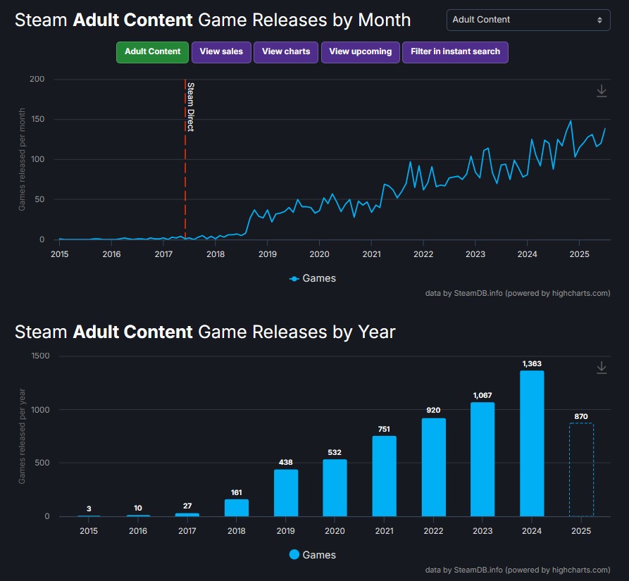 최근 몇 년간 스팀 등을 통해 성인 게임에 대한 수요가 크게 늘어났던 것은 분명 사실이다. 스팀 통계 사이트 'steamDB'에 따르면 스팀에서 '성인용 콘텐츠'를 포함한 게임은 2015년 3개에서 2024년 1,383개로 늘어났다. 수요가 늘어난 만큼 판매량도 늘어나는 추세였는데, 몇몇 게임은 출시 하루 만에 5만 장을 팔았다고 밝혔으며, 일본의 DLsite와 같은 사이트에서만 유통되다 스팀에 진출한 후 큰 상업적 성과를 거둔 사례도 있었다. 이러한 상업적 성과가 알려지며 성인 게임의 스팀 진출은 더욱 가속화됐다.