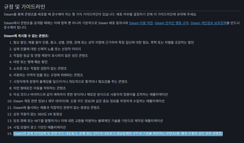 이어 2025년 7월 16일, 밸브는 스팀에서 게임을 판매하는 사람을 대상으로 방침을 안내하는 '스팀웍스'에 스팀 게임 구매, 자금 충전 등 결제 처리업체 및 카드 네트워크, 은행, 인터넷 네트워크 제공업체가 정한 규칙 및 표준을 위반할 수 있는 콘텐츠를 게시하지 못한다는 조항을 업로드했고, 발표 이후 스팀에서는 다수의 성인 게임이 제거됐다.