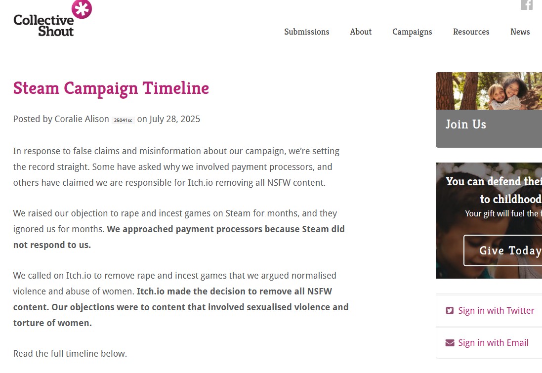 'itch.io'의 경우에는 더욱 큰 피해를 봤다. itch.io는 성인 게임을 다수 삭제하거나 대부분 검색되지 않도록 조치한 후 "4월 사이트에서 일시적으로 이용 가능했던 <노 머시>라는 게임이 삭제된 사건과 관련해, 콜렉티브 샤우트라는 단체가 스팀과 저희 사이트를 상대로 캠페인을 시작해 두 플랫폼에서 제공되는 특정 콘텐츠의 특성에 대한 우려를 결제 처리 업체에 전달했다"고 했다. "이어 결제 처리는 저희 플랫폼의 모든 크리에이터에게 중요하며, 결제 인프라 보호를 위해 긴급 조치를 취할 수밖에 없었다"고 했다.