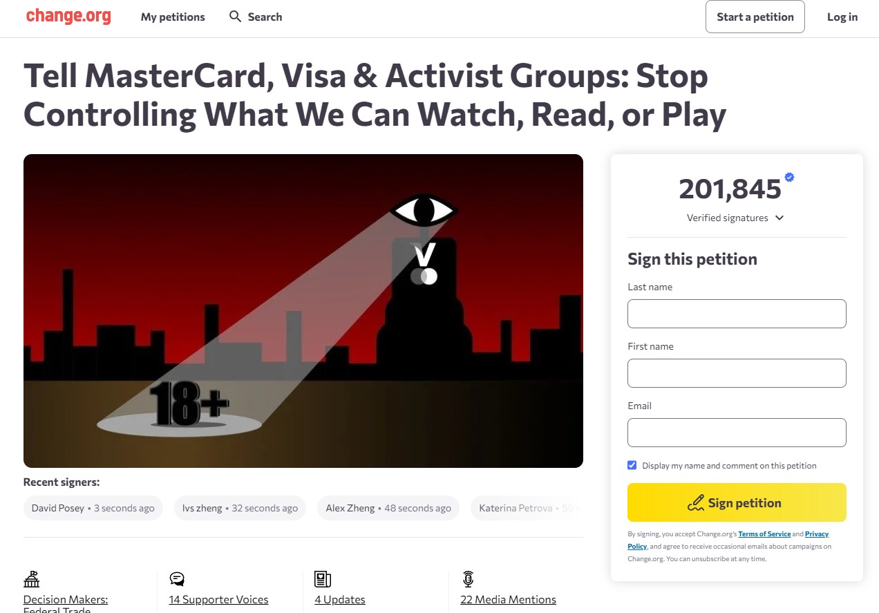 미국 서명 사이트 'change.org'에서 20만명이 참여한 서명 운동은 "온리팬스와 같은 플랫폼은 실제 성적 학대 콘텐츠를 보유하고 있다는 신뢰할 만한 폭로와 소송에도 불구 최소한의 감독만 받으며 운영되고 있다. 그러나 완전히 허구적인 묘사에는 신속하게 대응해 창작자를 차단하고 글로벌 검열을 하고 있다"라며 "특정 활동 단체가 모든 사람을 대변하는 것은 아니다"고 했다.