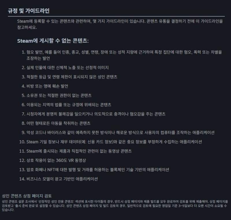 ▲스팀은 기존에도 '게시할 수 없는 콘텐츠'에 대한 규정을 명시하고 있었으며, 성인용 콘텐츠의 경우 일반적인 검토보다 조금 더 까다롭게 심사하고 있었다.