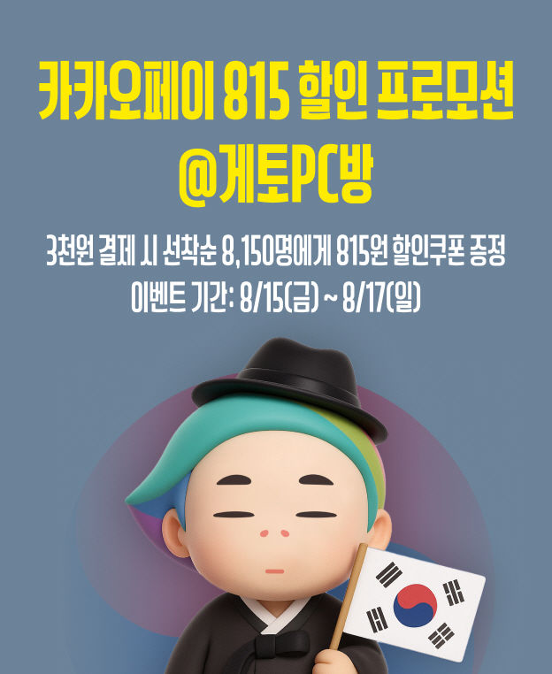 카카오페이머니 3,000원 이상 결제 시 8월 31일까지 사용 가능한 815원 할인 쿠폰이 선착순 8,150명에게 제공되며, 쿠폰을 다운로드한 상태에서 ‘게토’ 가맹 PC방에 방문하여 카카오페이머니로 1,000원 이상 결제하면 자동으로 815원 할인이 적용된다. 이벤트는 15일부터 매일 오전 8시 15분부터 시작되며 3일간 매일 1인당 1회 참여 가능하다.