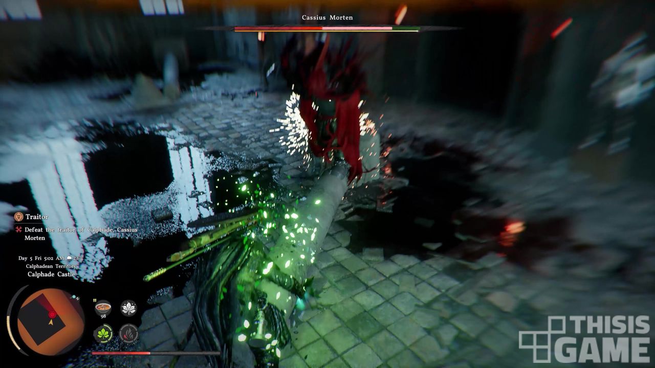 체험의 마지막은 보스전은 이 깃발들기를 기둥 부수어 때리기로 옮겨놨다. 보스 카시우스 모턴은 일반 공격을 아무리 많이 때려도 무찌를 수 없다. 일반 공격으로 스턴 상태를 만든 뒤에, 카시우스 모턴이 깨고 다닌 기둥을 앞선 과정대로 주워서 세 번 성공해야 한다. 전략적 사고를 요구하면서 긴장감을 높이는 보스전이었지만, 길지 않은 시연 단계에서는 도저히 익숙해지지 않았다. 체력 100% 상태로 무한정 부활할 수 있었으므로 어떻게든 공격에 성공을 할 수는 있었지만, 입력이 지나치게 길었다.