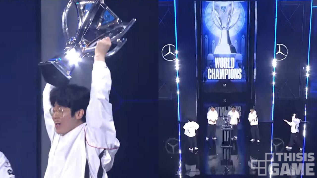 ▲ 제우스는 2024 월드 챔피언십 우승 직후 트로피 세레모니에서 높이 든 트로피에 머리를 찍혀 부상을 입었다. (이미지 출처: LCK 공식 유튜브)