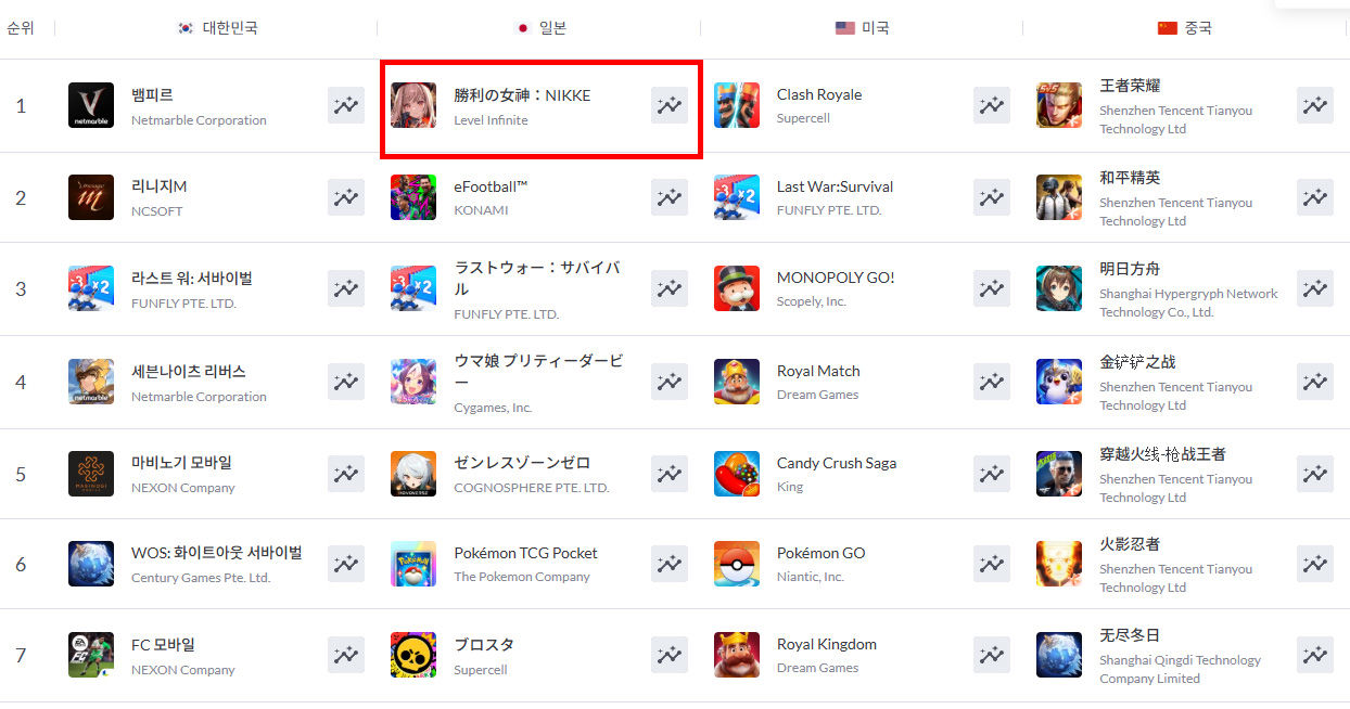 레벨인피니트가 서비스하는 <승리의 여신: 니케>가 일본 모바일 게임 시장에서 실시간 매출 순위 1위를 탈환하며 주목받는 성과를 거두었다. 4일 업데이트된 '바니걸' 대규모 이벤트의 영향으로 분석된다.