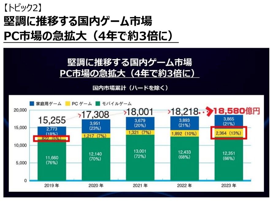 일본의 대표 게임 미디어 패미통 역시 이러한 변화를 감지하고 있었다. 취재를 위해 만난 패미통 측은 2023년 기준으로 콘솔(플레이스테이션, 닌텐도 스위치) 유저는 약 3,800만 명 이상, 모바일게임 인구가 약 4,000만 명 이상으로 여전히 가장 큰 사용자 기반을 유지하고 있고 말한다. 그럼에도 PC 게임 인구는 약 1,500만 명이라는 더 이상 무시할 수 없는 규모로 급성장했다.