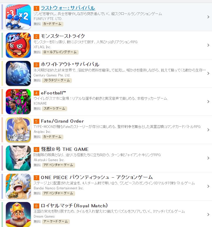 ▶ 일본의 모바일게임 시장 매출 순위도 정체되어 있는 건 마찬가지