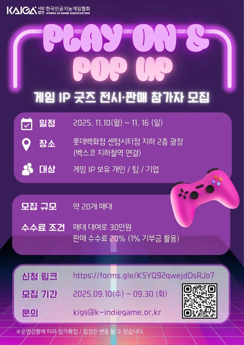 한국인공지능게임협회가 2025년 11월 10일(월)부터 16일(일)까지, 지스타(G-STAR) 개최 주간에 맞춰 롯데백화점 센텀시티점 지하 2층 광장에서 특별한 게임 IP 팝업 스토어를 연다. 이번 행사는 게임 IP를 기반으로 다양한 콘텐츠와 굿즈를 선보이며, 인디 게임 개발자들의 성장을 지원하기 위해 마련됐다.