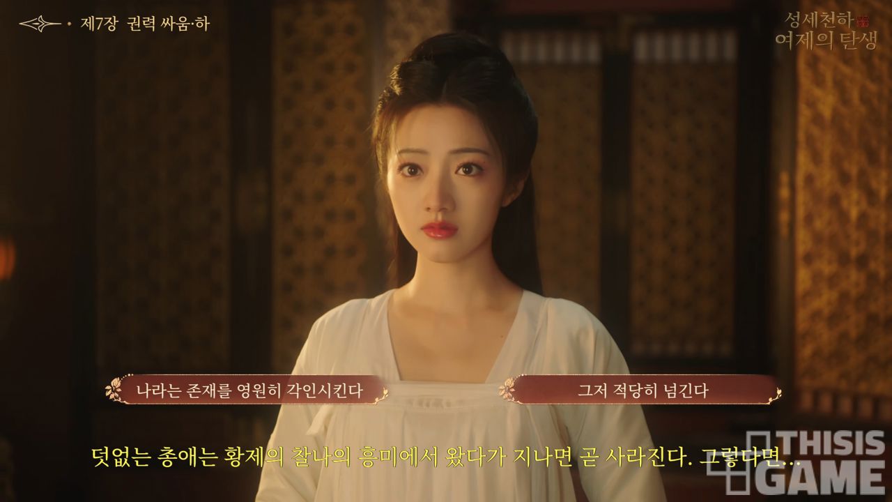 이런 강력한 여성상은 동서고금을 통틀어도 그 예를 찾기 드물 정도다. 어떻게 보면 이만한 게임 소재가 없는 것이다. 그만큼 <성세천하: 여제의 탄생>은 소재의 힘만으로도 큰 관심을 모으기에 충분하다. 여기에 FMV 특유의 몰입감 있는 연출과 배우들의 실감 나는 연기가 더해져 플레이어는 마치 역사 속 궁궐에 직접 들어간 듯한 경험을 하게 된다. 수십 개의 선택지와 다양한 루트는 단순한 시청자가 아닌 ‘참여자’로서 사건의 전개를 바꿔 나가도록 유도한다.
