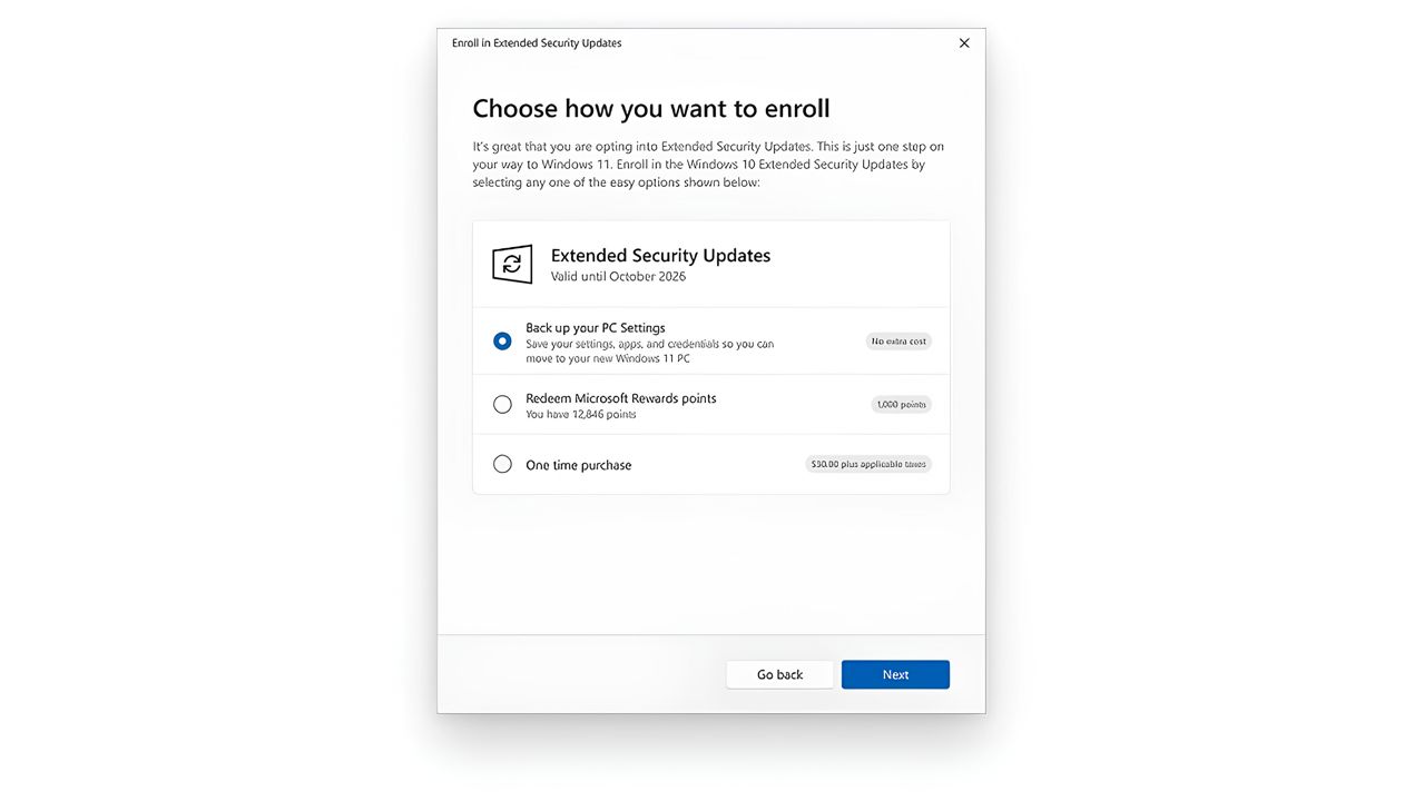 개인 사용자는 ▲윈도우 백업을 통한 설정 클라우드 동기화(추가 비용 없음) ▲마이크로소프트 리워드 포인트 1,000점 사용(추가 비용 없음) ▲유료 결제(한화 37,900원) 중 하나를 선택할 수 있다. 등록 기간은 2025년 10월 15일부터 2026년 10월 13일까지다.