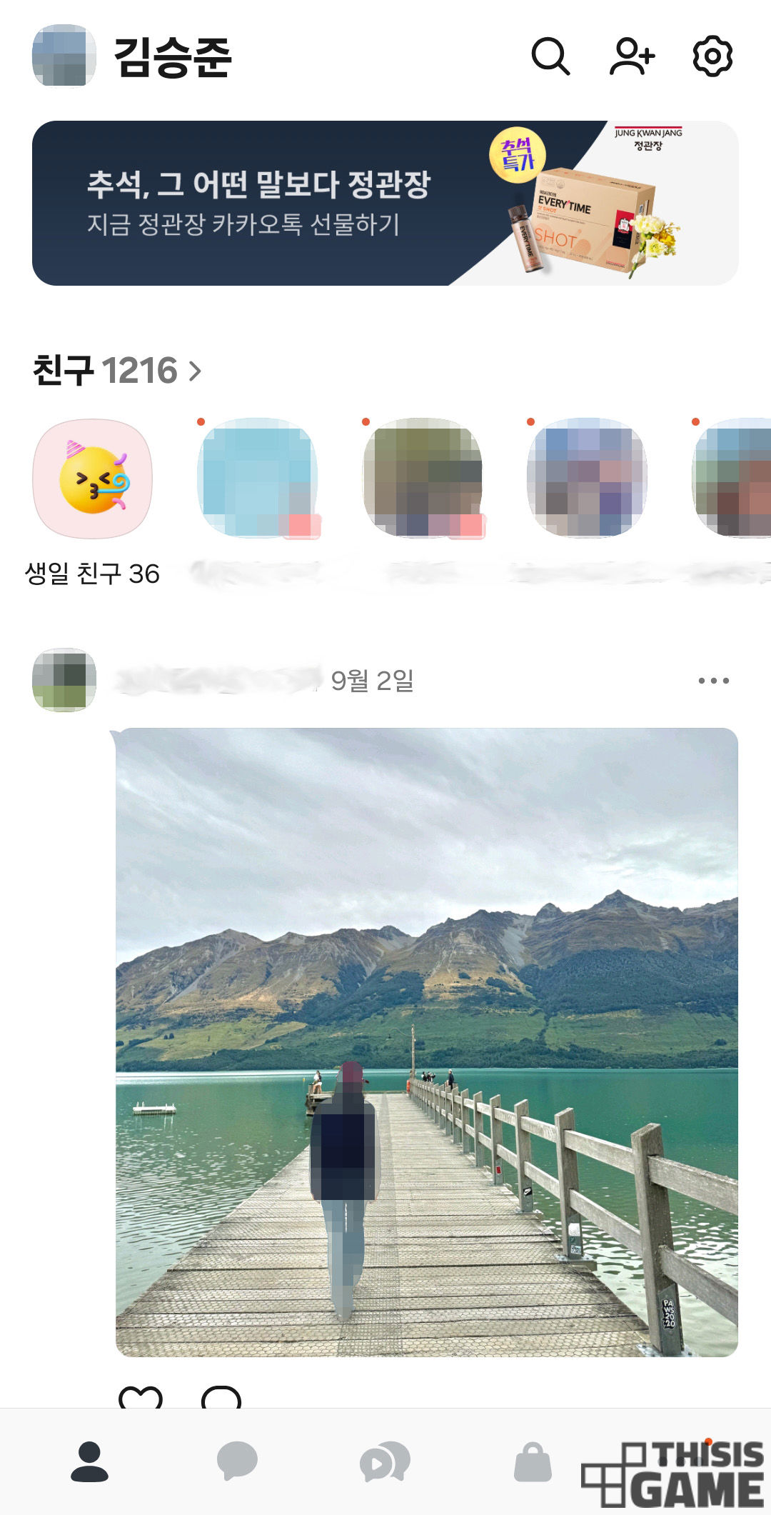 ▲ 카톡 업데이트 이후 앱에서 가장 먼저 보게 되는 문제의 친구 '피드'. 개인정보 보호를 위해 프로필 사진과 이름은 블러 처리했다. 광고가 상단에 먼저 뜨고. 9월 2일에 올린 피드가 다른 피드보다 먼저 뜨는지도 모르겠고. 친하지 않은 사람의 피드가 너무 많이 뜬다.