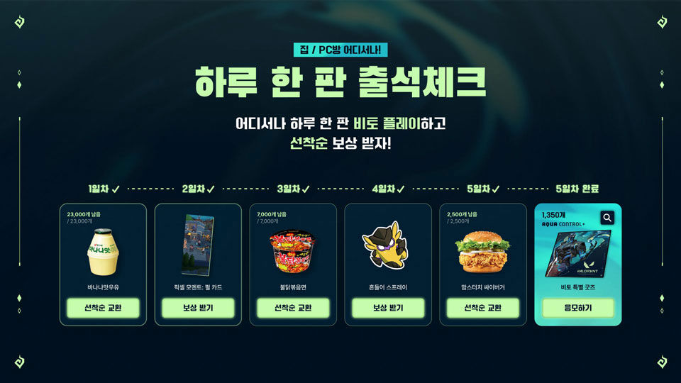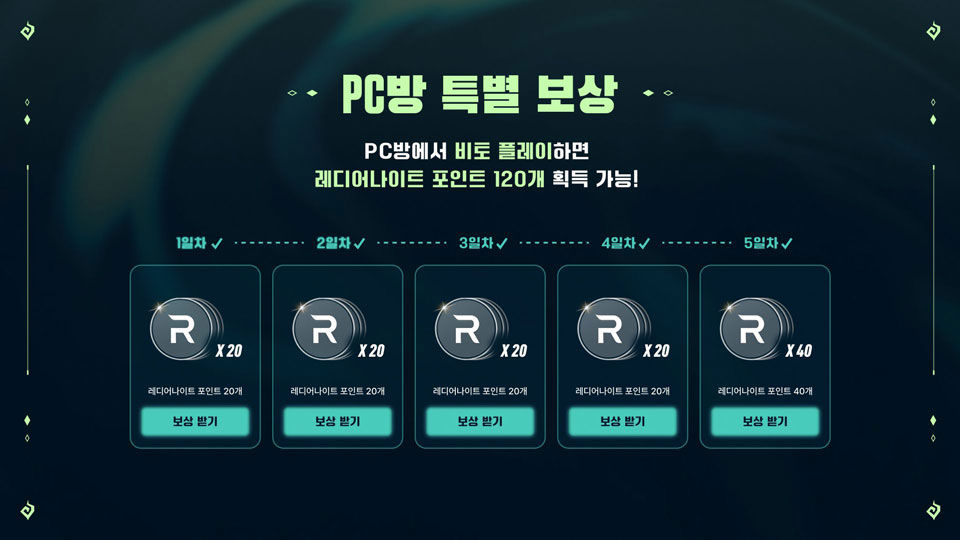 비토의 출시를 기념해 오는 28일(일)까지 '비토 출석체크 이벤트'가 진행된다. 이번 이벤트는 집이나 PC방 어디서든 하루 한 번만 플레이하면 참여가 가능하며 일반전, 경쟁전, 신속 플레이 모드에서 모두 참여할 수 있다. 이벤트 참여자들은 누적 출석 일수에 따라 다양한 선착순 보상을 받을 수 있다. 특히 PC방에서 참여 시 최대 120개의 레디어나이트 포인트를 추가로 획득할 수 있으며 비토 출시를 기념한 한정판 굿즈와 게임 내 아이템 쿠폰, 게이밍 기어등 풍성한 보상이 준비되어 있다.