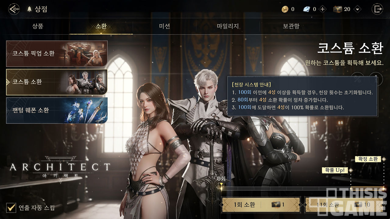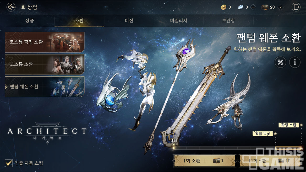▶ <아키텍트>의 뽑기 상품은 코스튬과 팬텀 웨폰 등 2종으로 '천장 시스템'도 마련되어 있다.