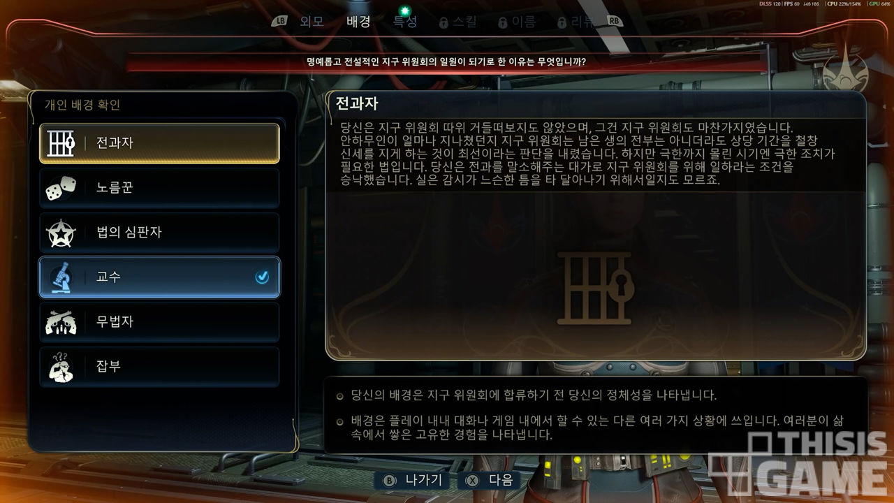 다른 RPG들에서도 종종 있는 설정이지만, 캐릭터의 출신을 골라 특수한 전용 선택지를 해금하거나 플레이 도중 다른 정보를 얻게 될 수 있습니다. 저는 고고학 연구를 했던 '교수' 출신을 택했더니 복잡한 방정식들을 이해한다거나 과학자들 앞에서 똑똑함을 자랑하는 대사를 날리며 기싸움에 지지 않을 수 있더라고요.