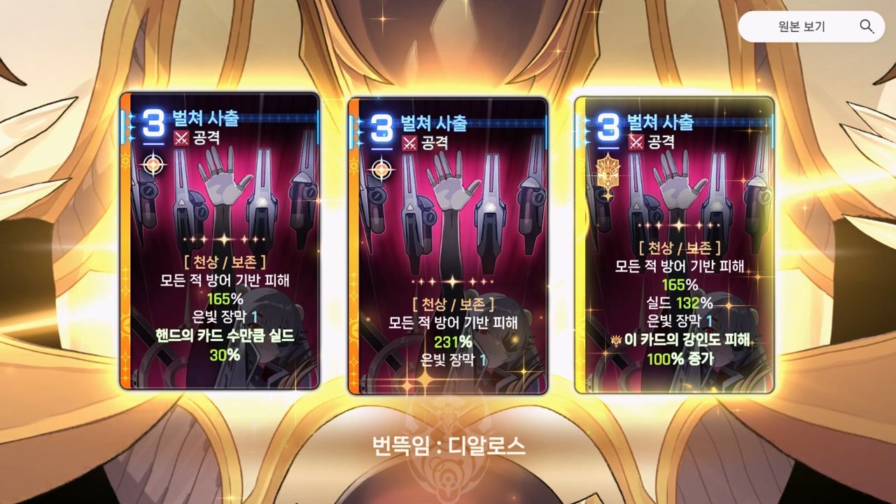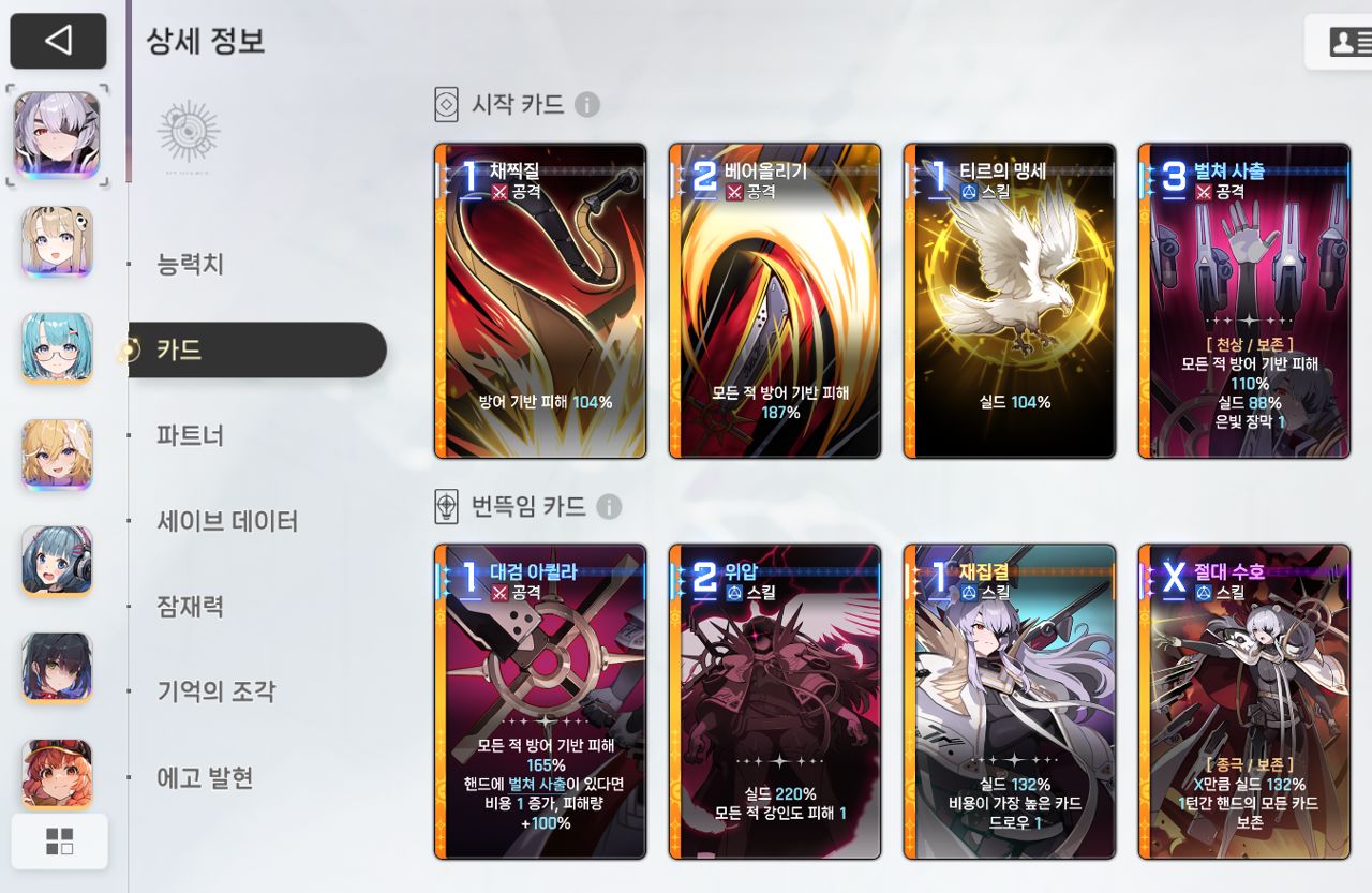 캐릭터들은 저마다 위에 표시되는 '시작 카드' 4장만 가지고 카오스에 진입한다. 하지만 플레이하면서 각종 이벤트를 보면서 밑의 '번뜩임 카드'를 얻거나 카드를 강화하게 된다.