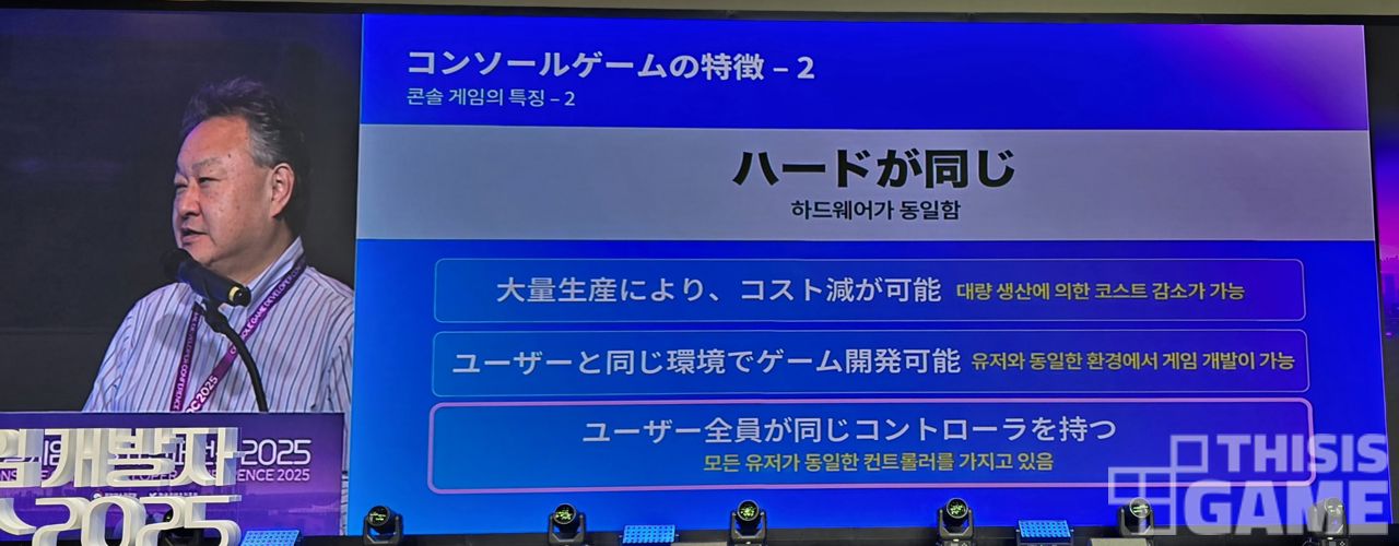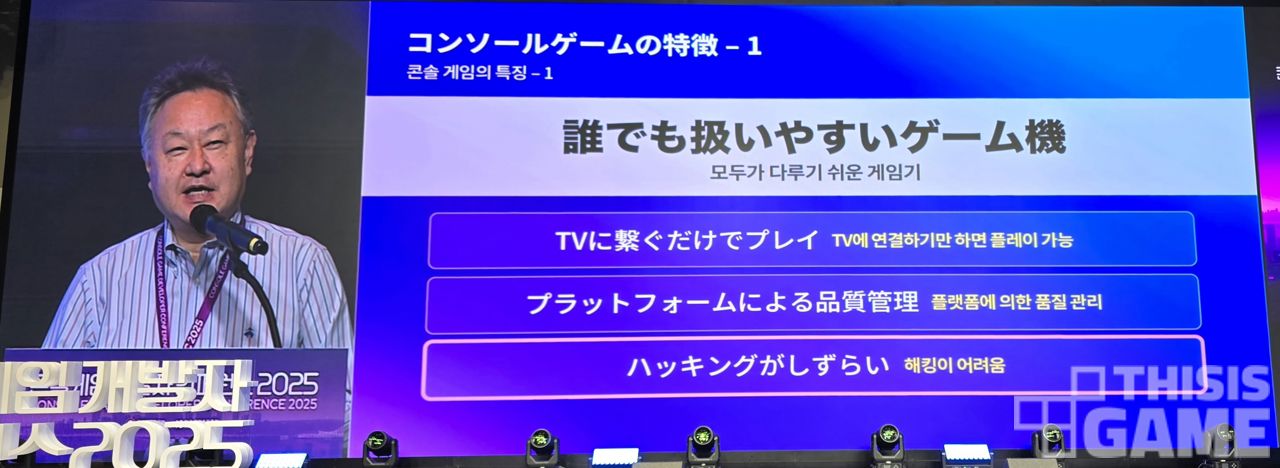 요시다 슈헤이는 콘솔 시장의 특징에 대해 먼저 짚었다. 플레이스테이션, 닌텐도, 엑스박스 등 우리가 콘솔이라 흔히 부르는 기기는 "아이부터 노인까지 모두가 다루기 쉬운 게임기"로 만들어진 것을 지칭한다는 설명이다.