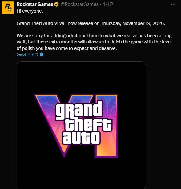 락스타 게임즈는 공식 X(구 트위터) 계정을 통해 성명을 내고 "오랜 기다림에 시간을 더하게 되어 유감"이라며, "이 몇 달간의 추가 시간은 우리가 기대하는 수준의 완성도로 게임을 마무리할 수 있게 해줄 것"이라고 설명했다.