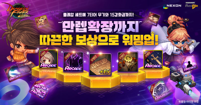 넥슨은 쇼케이스를 기념해 이용자들에게 다양한 보상을 제공한다. 2025년 12월 31일 오전 6시 이전까지 <던전앤파이터 모바일>에 접속한 모든 이용자는 아케이드 기념 오라, 칭호, 크리쳐 및 '전직 변경권', '65레벨 7티어 무기 선택 상자', 마스터 칼레이도 박스', 모든 장비에 사용 가능한 '15강화권' 등을 획득할 수 있다. 이와 함께 최고 레벨 확장이 진행되는 11월 20일부터 게임에 접속하면 '80레벨 점핑권'을 선물한다. 또한 공식 홈페이지를 통해 업데이트 사전등록 이벤트를 진행하며, 참여한 모든 이용자에게 보상으로 '마스터 계약 30일', '만렙 확장 기념 스티커 5종 상자'를 지급한다.