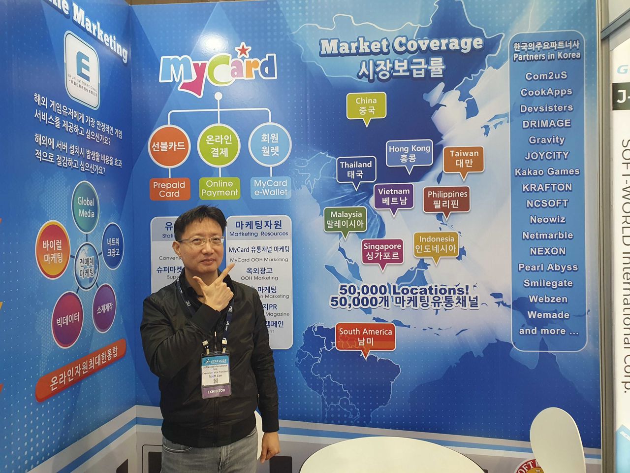 이어서 발걸음을 옮긴 곳은 대만 기업 소프트월드 부스였습니다. 소프트월드는 대만·홍콩·마카오(대홍마) 지역을 메인으로 하며 현재는 글로벌 및 동남아 시장에서 사업을 영위하고 있습니다. 핵심 사업은 '마이카드(MyCard)'라는 자체 결제 시스템을 중심으로, 게임 페이먼트, 디지털 마케팅, 현지화(Localization), 커뮤니티 및 CS 운영 대행 등 게임 관련 모든 원스톱 서비스를 제공합니다.
