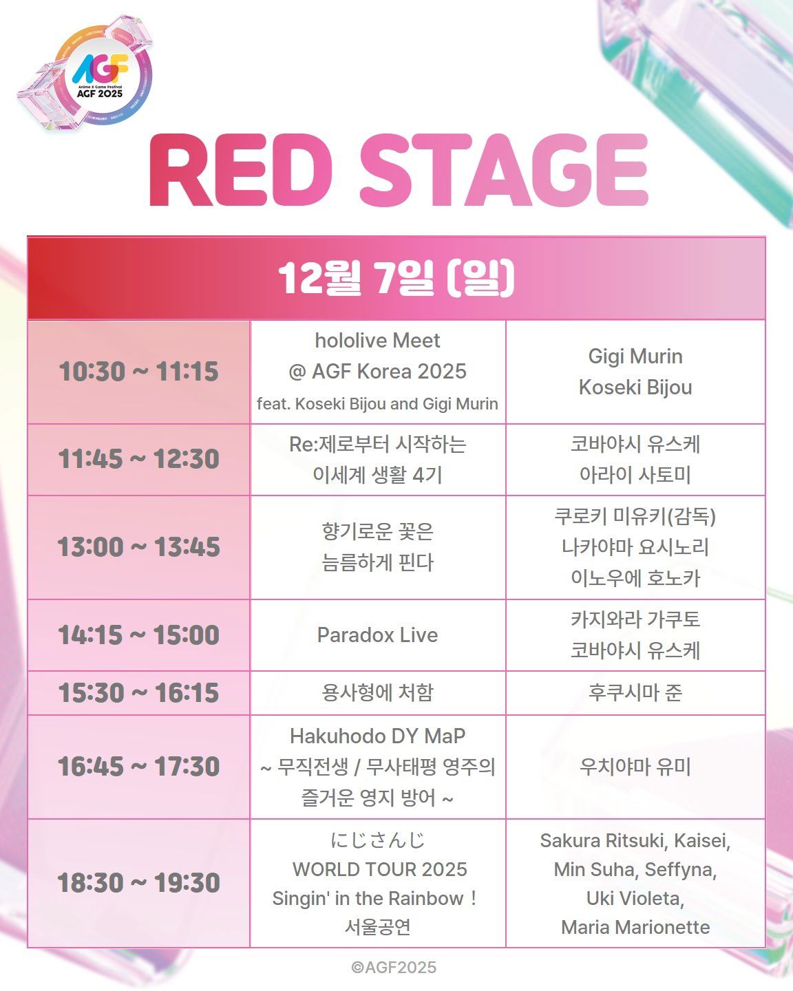 국내 최대 규모의 애니메이션 X 게임 축제 'AGF Korea 2025'(Anime X Game Festival 2025)가 오는 12월 5일(금)부터 7일(일)까지 3일간, 일산 킨텍스 제1전시장에서 개최된다. 특히, AGF의 대표 공연 프로그램 'RED & BLUE 스테이지'를 빛낼 역대급 게스트들의 최종 명단이 공개되며 팬들의 기대가 그 어느 때보다 높아지고 있다.