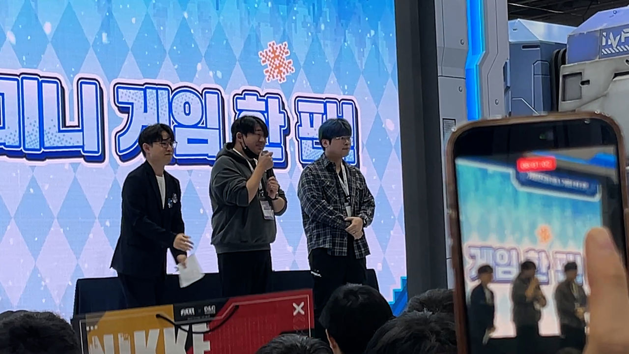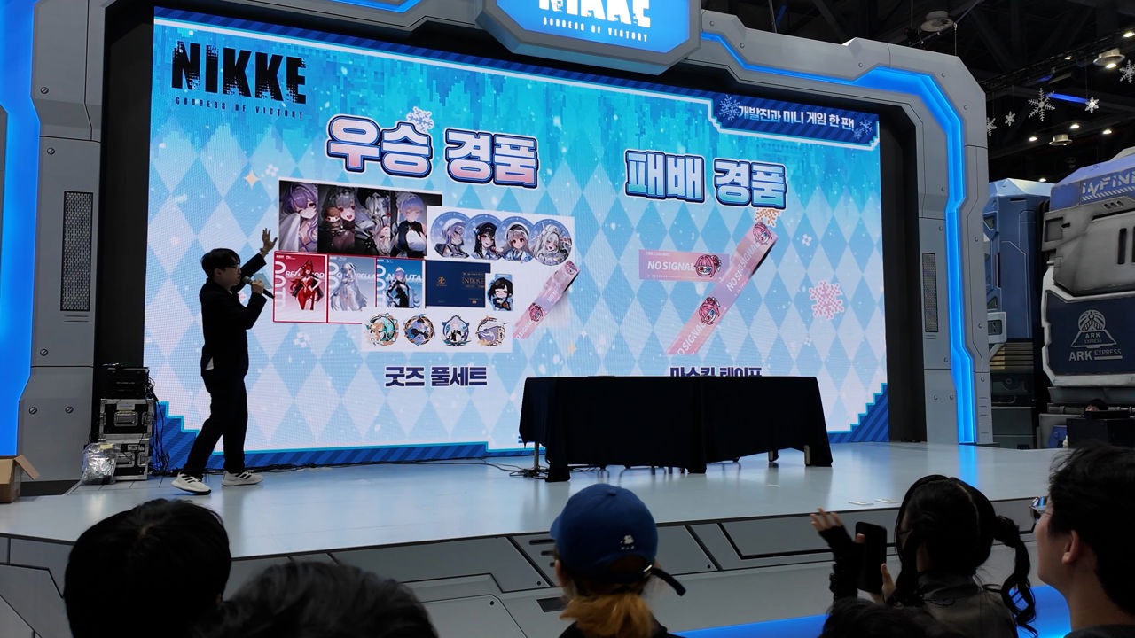 압권(?)은 매일 매일 <승리의 여신: 니케> 유형석 디렉터와 '코스모그래프' 주종현 사운드 디렉터가 무대위에 올라 유저들과 '미니게임'으로 승부를 펼친 것인데요.
