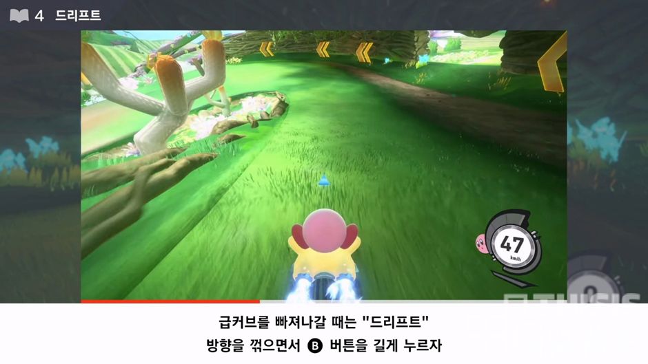 보통 레이싱 게임은 스틱을 앞으로 기울이고, 가속 버튼을 누르며 속도를 직접 조절한다. 따라서 자연스럽게 ‘내가 조종하고 있다’라는 감각을 느낄 수 있다. 하지만 <커비의 에어 라이더>의 머신은 아무것도 조작하지 않아도 앞으로 나아가는 형태이다.